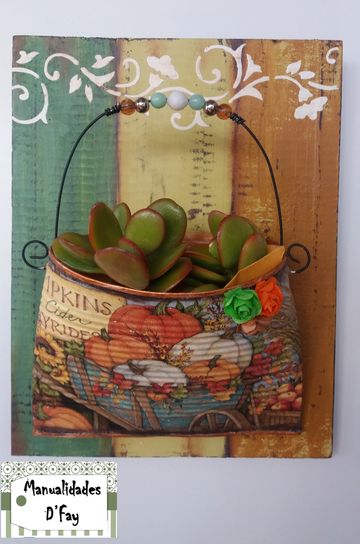 Madera pintada estilo vintage con lata decorada para poner plantas.